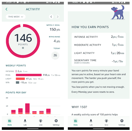 Amazon Haloは運動量をモニターし、体を動かした量をポイントで表示する(下の写真、左側)。一週間に150ポイントを得ることが目標で、その過程がグラフで表示される。1ポイントは1分間に中程度の運動をする量となる(右側)。中程度の運動とは、速足でのウォーキングやほうきで庭を掃除する程度の運動で、医療学会American Heart Associationは一週間に150分の運動を推奨している。Amazon Haloは加速度センサーと心拍数センサーで運動量を算定する。