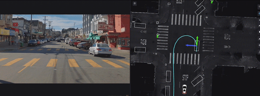 自動運転車の開発でカギを握る技術は認識したオブジェクトの次の動きを予測すること。周囲のクルマや歩行者の次の動きを機械学習の手法で予測する。機械学習は一般的なケースだけでなく、特異な動きをするケースも予測する。例えば、前のクルマが右に膨らんで走ると(下の写真、左側)、AIはこのクルマはUターンすると推論する(右側、緑色の線)。人間も経験を積んでこれを学ぶが、サンフランシスコのような込み合った市街地の走行では高度な推論機能が必須となる。