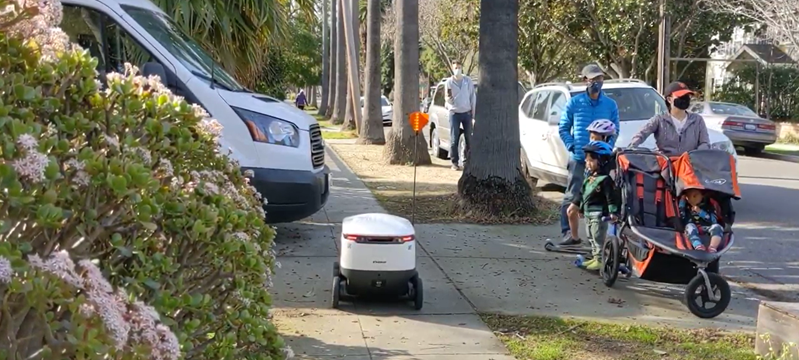 シリコンバレーでは既に「Starship」がレストランの料理を出前している。これは宅配専用のロボットで、歩道を自動で走行し、路上の障害物を上手く回避して走る(下の写真)。これに対し、Nuroはクルマ形状の配送車両で、多くの荷物を遠くまで運べることが特徴となる。Nuroはスーパーマーケットの生鮮食料品の宅配などで使われる。
