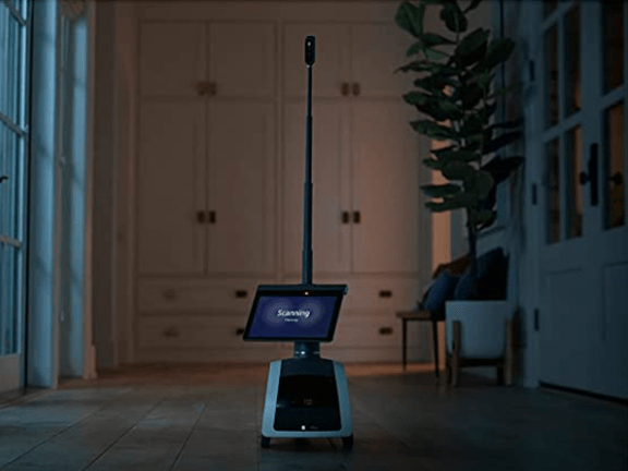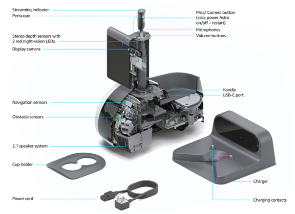 ロボットはエンターテイメントとセキュリティを目的に開発された。ロボットは”移動式AIスピーカー”という構成で、人間の言葉を理解してタスクを実行する。ロボットに指示するときは、「Astro」と呼びかける。「Astro, call Mom」と指示すると、ロボットはお母さんに電話してビデオで通話する(下の写真、左側)。ロボットは利用者をフォローする機能があり、家の中で移動しながら通話できる。また、「Astro, Take this to Alicia」と言えば、飲み物を指示した人物に届ける(中央)。ロボットは顔認識機能があり、人物を見分けることができる。更に、「Astro, remind Lucas…」と言えば、指示した人物にリマインダーを送信する(右側)。