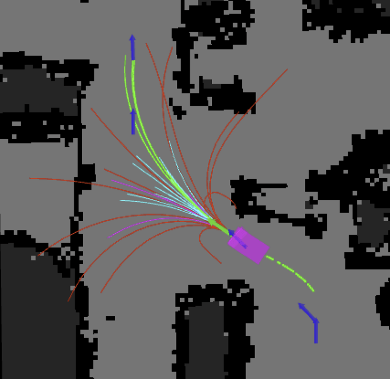 生成されたマップでロボットは目的地に移動するための最適なルールを算出する。アルゴリズムは数百のルートを検証し、そこから最適なものを選ぶ(下の写真)。AIは長期的な経路(下の写真、青色の線)と短期的な(2-3秒先の)経路(緑色の線)を算出する。更に、自動運転車とは異なり、家の中では決められたレーンは無く、また、床に物が置かれるなどして経路が塞がれる事象が発生する。周囲の状況は頻繁に変わり、その都度、アルゴリズムがルートを再計算し、新しい環境に適応する。