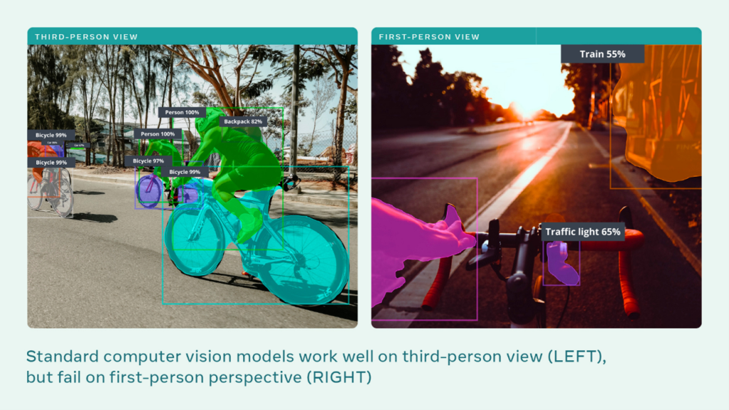 コンピュータビジョンの進化でAIはオブジェクトを認識しその種別を正確に判定する。しかし、これらのAIは第三者視点(third-person perspective、下の写真左側)で開発されたもので、傍観者としてオブジェクトを判定する。これに対し、Facebookは第一者視点(first-person perspective、右側)でアルゴリズムを教育する研究を開始した。この技法は「Egocentric Perception」と呼ばれ、開発されたAIは当事者の視点でオブジェクトを判定できるようになる。これをARグラスやVRヘッドセットに搭載すると、AIがアシスタントとして周囲の状況を把握し最適な助言を行う。また、ロボットへ適用すると、AIが視覚となり実社会の中を自律的に稼働するシステムにつながる。(下の写真はサイクリングに関する画像認識の判定結果。第三者視点で開発されたAIの判定精度は高いが(左側)、第一者視点で開発されたAIの判定精度はまだ低い(右側)。)