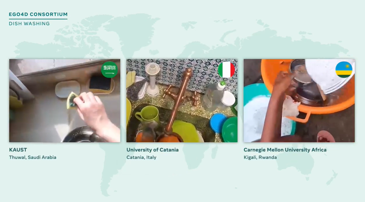 開発者はスマートグラスなどを着装してカメラで日常生活を録画する。これら録画されたビデオにその意味を付加して、生活の中での動きとその説明文のペアを作る。これらのビデオを集約したデータセットを構築し、これらのデータを使ってAIを教育するプロセスとなる。日常生活の様式は国により異なり、Facebookは主要国の大学と共同でこれを進めている。(下の写真;皿洗いを撮影したビデオで、左からサウジアラビア、イタリア、ルワンダの事例となる。)