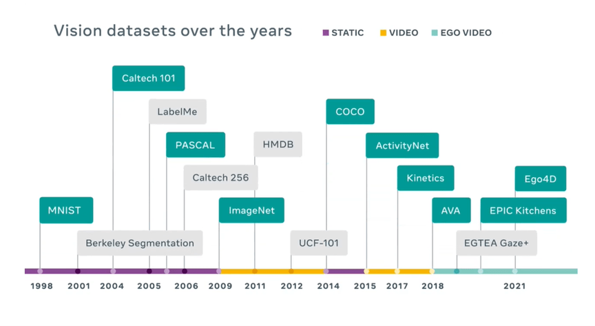AI開発でオブジェクトの形状を把握するコンピュータビジョンが急成長しているが、アルゴリズムを教育するためのデータセットが技術進化を支えている(下の写真)。AI開発の初期には手書き文字を判読するためのデータセット「MNIST」が開発された。コンピュータビジョンが急速に進化したのは、イメージのデータセット「ImageNet」の存在が大きい。ここには大量の写真とタグが格納され、これによりAIが人間の視覚を上回った。これらはすべて第三者視点のデータセットで、Ego4Dが第一者視点の最初のデータセットとなる。
