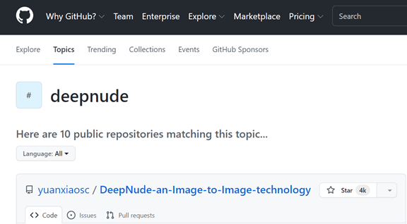 サイトXが注目される理由は、高精度なヌードイメージを生成するためである。現在、女性を裸にするAIの代表は「DeepNude」というアルゴリズムで、オープンソースとしてGitHubに公開されている(下の写真)。誰でも自由にこのAIを使い、”脱がせアプリ”を開発できる。実際に、ネット上にはDeepNudeで開発したアプリが多数掲載されている。