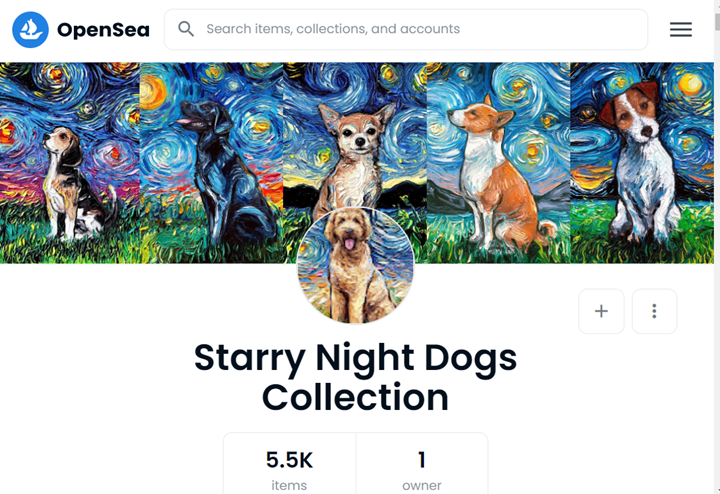 テキサス州サンアントニオに住むアーティストAja Trierは、犬をモチーフにしたデジタルアート「Starry Night Dogs」を制作している。犬の背景が、ゴッホの星月夜「The Starry Night」のデザインで、独特の筆遣いがデジタルアートに取り込まれている。TrierはこのデジタルアートをNFTに変換し、マーケットプレイスで販売している(下の写真)。このデジタルアートが盗まれ、犯罪者はこれをNFTに変換し、マーケットプレイスで販売していることが判明した。