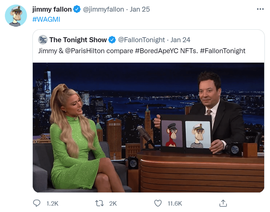 何の変哲もないデジタルアートになぜ破格の値段が付くのか議論を呼んでいる。理由の一つが、著名人の影響で、セレブが競ってNFTを購入しているという事情がある(下の写真)。有名モデルParis Hilton(左側の人物)と、トーク番組司会者Jimmy Fallon(右側の人物)は、相次いでBored Ape Yacht Clubを購買した。両者はトークショーで、NFTをプリントアウトしたものを示し、一躍、Bored Ape Yacht Clubの名前が全米に広がった。このようなセレブの“PR活動が”NFT人気を押し上げている。