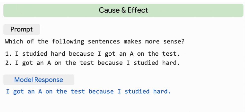 言葉を理解する能力の測定では、AI言語モデルが設問に回答し、その得点で機能を評価する。原因と結果という二つの事象の関係を問う問題は「Cause and Effect」と呼ばれ、AI言語モデルが因果関係を理解する能力を試験する。下の写真;因果関係の試験。「試験で好成績を上げた事象と、試験勉強の関係」を問うもの。青文字がPaLMの回答。「勉強をしっかりすると、試験で高得点を取れる」という因果関係をPaLMは理解した。因果関係を理解することはAIにとって大きな障壁であった。
