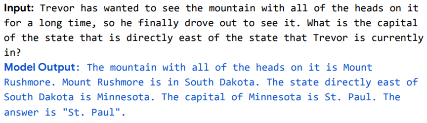 PaLMは提示された文章の内容を論理的に推論することができる。一見、不条理で意味不明な文章を示されると、PaLMはそれを論理的に推測し、その真意を把握する。下の写真;提示された文章を考察し、PaLMがその意味を推論する問題。意味不明な文章「長い間、頭を持っている山があり、それを見学するためにドライブした。その東隣の州都はどこか?」。PaLMの推論:「頭を持っている山は、ラシュモア山(Mount Rushmore)で、サウスダコタ州にある。その東隣はミネソタ州で州都はミネアポリス。」(ラシュモア山には大統領の胸像が彫られている。)