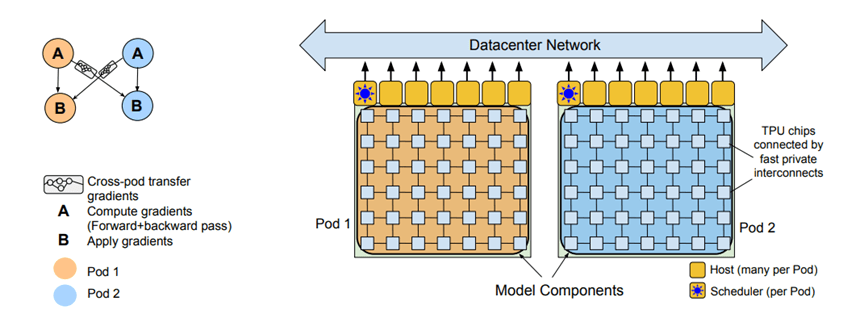 PaLMは「Pathways Language Model」の略で、AIモデル「Transformer」を「Pathways」という方式で教育した言語モデルを意味する。Pathwaysとは、大規模なアルゴリズムの教育を並列に実行する方式で、多重で処理することで処理効率を上げることができる(下の写真)。教育では二つのPod(Pod 1とPod 2)を使い、教育データを二分割 (AとB)し、それぞれのPodで実行する。Aのデータで教育が終了すると、その結果(Gradient)をBに送り、残りの半分のデータを教育する。これにより、Podを効率的に使うことができ、稼働率57.8%を達成した。