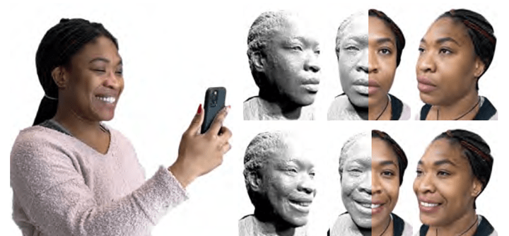 次に、このベースモデルを使って、利用者のアバターを生成する。スマホカメラを使い、顔を異なる方向から撮影し、これをベースモデルに入力する(上のグラフィックス、中央)。アルゴリズムは顔の構造とその表情を学習しており、数枚の顔写真から高精度な3Dアバターを生成する。更に、スマホカメラで異なる表情の顔写真を撮影すると、アバターの品質を大きく向上させることができる(上のグラフィックス、右側)。