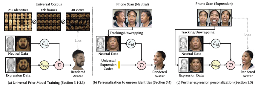AIでアバターを生成するが、その手順は次のようになる。最初に、ベースモデル「Universal Prior Model」を生成する(下のグラフィックス、左側)。ベースモデルの生成では、多数の顔写真を教育データとし、アルゴリズムは顔の構造とその表情を学習する。具体的には、上述の専用カメラMUGSYを使い、255人の顔を25方向から撮影し、その際に、被写体は65の表情を造る。これらの顔写真から、アルゴリズムは人間の顔の構造とその表情を学習する。