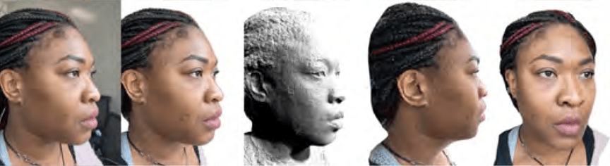 現実型アバターは、利用者の顔をビデオ撮影したように、リアリスティックに生成する。これは特殊カメラを使って生成されてきたが、上述の手法を使うと、iPhoneカメラで誰でも手軽に作れるようになった。(下の写真、左端は入力した写真で、その他は生成されたアバター。中央はアバターの深度を表示)。但し、メガネをかけたアバターを高精度で生成できないなど、制限事項があり、完成までにはもう少し時間を要す。