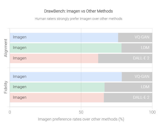 GoogleはAIが生成したイメージの出来栄えを評価するベンチマークテスト「DrawBench」を開発した。いま、言葉で作画するAIの開発がブームになっているが、その機能を客観的に評価する目的で開発された。ImagenやDALL·E 2などで生成されたイメージを、人間が判定してその機能を評価する。ベンチマークは、言葉の指示をどれだけ正確に理解したかを判定する「Alignment」と、生成されたイメージがどれだけ正確かを評価する「Fidelity」で構成される。Imagenが二つのカテゴリーでDALL·E 2など他社の技術を大きく上回った(下のグラフ)。