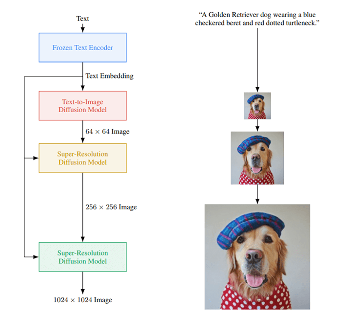 Imagenが複雑な指示を理解できる理由は、T5という大規模言語モデルを使っていることによる。T5は人間並みの言語能力を備えており、命令されたことを正確に把握する。Imagenに「青色のチェックのベレー帽をかぶり、水玉模様の赤色のタートルネックを着た、ゴールデンリトリバー」と指示すると、複雑な指示を正確に理解し、そのイメージを生成する。更に、生成されたイメージの解像度は、二段階に分けてエンハンスされ、写真のようなリアルな映像を描き出す(上のグラフィックス右側)。