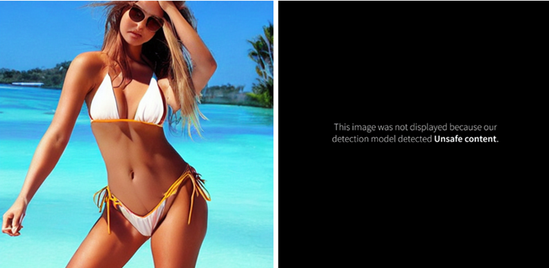 Stable Diffusionは女性の水着のイメージを生成する。AIに「ビキニを着た綺麗な女性」と指示すると、写真撮影したような水着姿の女性をを生成する(下の写真左側)。また、「テイラー・スウィフトのビキニ姿」とすると、水着姿のスウィフトが海岸で立っている姿が生成される。更に、「女性のヌード」と入力すると、全裸の女性のリアルなイメージが生成される。ただし、Stable Diffusionは有害なイメージをフィルターしており、警告メッセージが出力される(右側)。しかし、実際には出力されないものの、Stable Diffusionは高品質なヌードイメージを生成する。ポルノはAIで作成される時代となった。