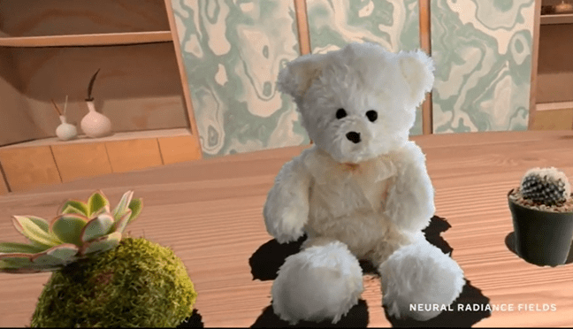 MetaはAIを使って3Dモデルを簡単に生成する技法を発表した。これは「Neural Radiance Fields」と呼ばれ、カメラで撮影した複数の写真をAIで繋げ、3Dイメージを構築する技法となる。例えば、クマのぬいぐるみを、スマホで複数の方向から撮影し、これをAIで繋ぎ合わせると、3Dのモデルを生成できる(下の写真)。3Dモデルを簡単に生成できるため、メタバースを構築する基礎技術として期待されている。