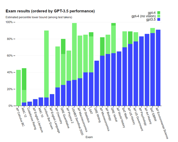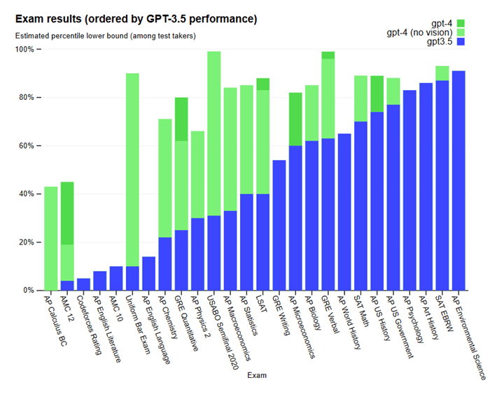 実際に、この機能は試験問題を回答する技量で発揮された。GPT-4は高校生向けの数学の試験「AMC 12」を受け、上位50%の成績を収めた(下のグラフ、左から二番目)。ChatGPTから大きく性能が向上したが、これは「Vision(視覚)」を試験問題で使ったことによる。数学の試験では図表が使われ、ChatGPTはこれを理解することができなかったが、GPT-4は視覚を得て、人間のようにテキストと図表を理解して数学の問題を解いた。これにより成績が格段に向上した。(下グラフは試験問題に対する成績を示している。青色がGPT-3.5(ChatGPT)で、緑色がGPT-4。緑色でも濃い部分はビジョンを使って問題を解いた時の成績。)