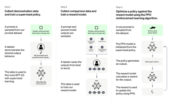 OpenAIは、GPT、GPT-2、GPT-3を開発してきたが、ChatGPTはその後継モデルになる。公開と同時にChatGPTは大ヒットとなり、利用者数は1億人を突破した。Huangは、ChatGPTがブレークした理由はユーザインターフェイスで、使いやすい構造で、誰もが高度なAIを使うことができるようになったと分析する。ChatGPTのインターフェイスは対話モデルで、人間と対話する要領で、ChatGPTを使うことができる。このインターフェイスは「Reinforcement Learning from Human Feedback (RLHF)」という手法で開発された(下のグラフィックス)。ChatGPTの回答を人間が評価し、それを強化学習のモデルにフィードバックし、ChatGPTが回答の仕方を学習する。(グラフィックス:指示に従って回答を出力するスキルを獲得するプロセス。人間が手本を示し、これをChatGPTの強化学習モデルが学び、解答するスキルを向上させる。)
