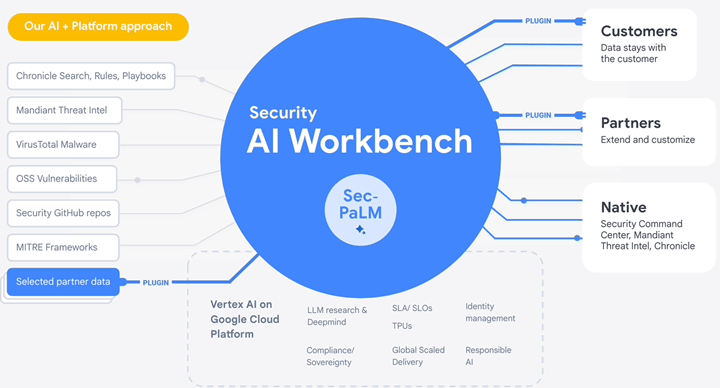 AI Workbenchの教育では、セキュリティに関する大量のデータが使われ、モデルはマルウェアに関する高度なスキルを学習した(下のグラフィックス)。これは「セキュリティ・インテリジェンス」と呼ばれ、Googleが収集したデータの他に、パートナー企業であるMandiantが保有するデータが使われた。具体的には、システムの脆弱性、マルウェア、攻撃のシグナル、攻撃の特性やその挙動などに関するデータで教育され、アルゴリズムはサイバー攻撃に関する包括的なスキルを学習した。