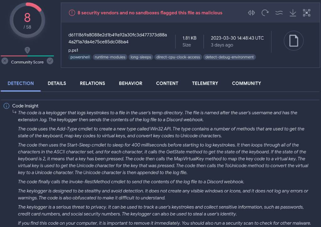 GoogleはAI Workbenchを統合したセキュリティサービス「VirusTotal Code Insight」(下の写真)を開発した。このサービスはコードをスキャンし、それがマルウェアであるかどうかを判定する。その際に、マルウェアである確度(下の写真上段、レベル8)と、マルウェアの特性や挙動を分かりやすい言葉で説明し(下段)、分かりやすいインターフェイスで迅速な対応が可能となる。VirusTotalはGoogleが買収した企業で、マルウェアに関する情報を集約したウェブサイトを運営している。