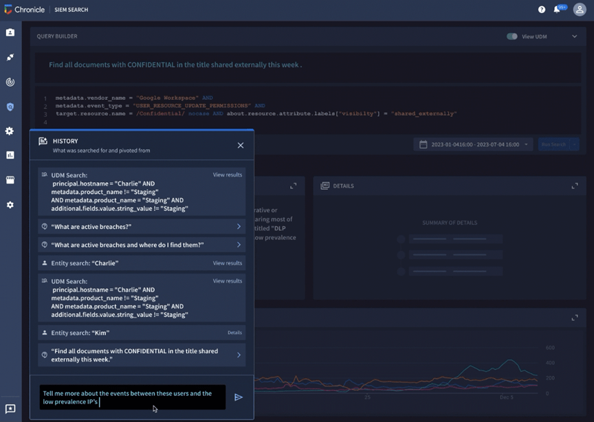 Google Cloudは大量のログデータから攻撃のシグナルを検知するセキュリティ機能「Chronicle Security Operations」を提供している。Chronicle Security OperationsはAI Workbenchを統合し、インテリジェントにサイバー攻撃を検知する技術を提供する。専門家に代わりAIが検索のためのクエリーを生成し、自律的に攻撃を検索し、その結果を分かりやすく表示する。これにより、セキュリティ専門家でなくても、マルウェアによる攻撃を検知できる。(下のスクリーンショットは「CONFIDENTIAL」というタイトルのドキュメントを外部に送信したイベントを検索した事例で、データリークを迅速に検知する)。