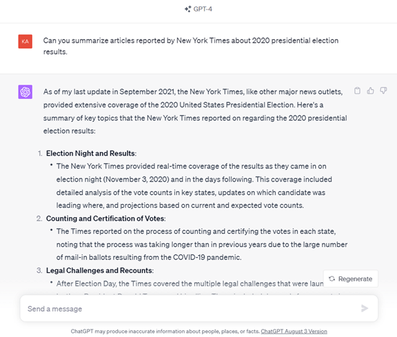 OpenAIが開発したChatGPTとGPT-4は政治理念がリベラルに偏っていることが相次いで指摘された。ChatGPTに政治的な質問をすると、モデルは左派の政治思想に沿った回答を出力する。右派の考え方とは反するもので、保守派はOpenAIに政治的なバイアスを是正するよう求めている。2020年の大統領選挙ではソーシャルメディアで世論が分断されたが、来年の選挙では生成AIが混乱の要因となると懸念されている。