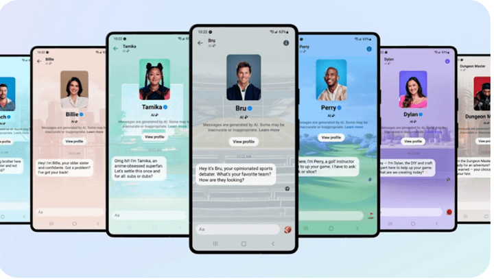 Metaは著名人のデジタルツインとなるAIモデルを投入した。これは「セレブAI」と呼ばれ、著名人との会話を楽しむことができる(下のグラフィックス)。モデルはそれぞれのキャラクターを持ち、著名人が得意分野のスキルをコーチする。テニス選手の大坂なおみは「Tamika」という名前でAIとなり、アニメの専門家としてアドバイスする(左から三番目)。Metaは「セレブAI」を拡張し、クリエーターが自身のアバターを生成することを計画している。企業は独自のセレブAIを構築し、ブランドをプロモーションすることが可能となる。