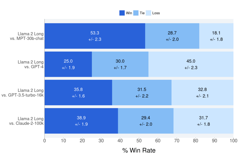 このモデルは「Long-context Language Models」と呼ばれ、長いコンテクストを正しく理解できる言語モデルとなる。このモデルは、同時に、チャットボットの基本機能である、問われたことに正しく回答する機能も向上した(下のグラフ)。ベンチマーク結果によると、Llama 2 Longの精度は「GPT-3.5 Turbo」(下から二番目)と「Claude-2」(最下段)を上回った。しかし、GPT-4の精度には及ばなかった(下から三番目)。