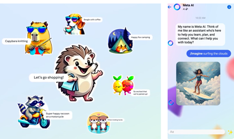 Metaは同時に、テキストでイメージを生成するモデル「Emu」を公開した。EmuはMeta AIの中で使われ、言葉の指示に従って、カラフルなイメージを生成する。この機能を使うと、言葉でスタンプを生成できる(下のグラフィックス左側)。「買い物に行こう」とテキストを入力すると、これに応じたスタンプを生成する(中央)。また、Meta AIに、「雲の上でサーフィン」と指示すると、そのイメージが生成される(右側)。Meta AIはFacebookやInstagramやWhatsAppに展開され、友人にオリジナルなスタンプやイメージを送るために使われる。