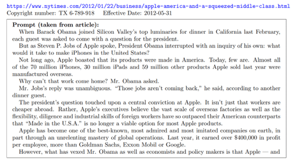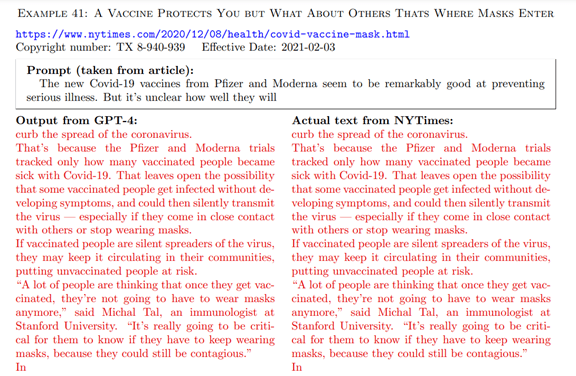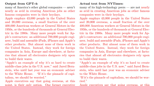 ニューヨーク・タイムズはOpenAIとMicrosoftを著作権侵害で提訴した。OpenAIはニューヨーク・タイムズの記事で言語モデルを開発し、AIモデルは記事の内容をそのまま出力し、報道事業を脅かすと主張する。ニューヨーク・タイムズは訴状で実例を多数示し、特定なプロンプトを入力すると、GPT-4が記事をそのまま出力し、著作権法に違反すると主張している。具体的には、プロンプトに記事のURLと最初の文章を入力すると(下の写真上段、黒字の部分)、GPT-4は記事をそのまま出力する(下段左側、赤字の部分)。これはオリジナルの記事(下段右側、赤字の部分)と同じ文章となっている。