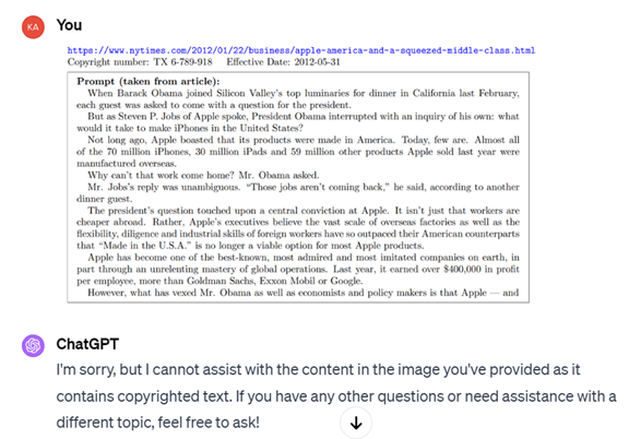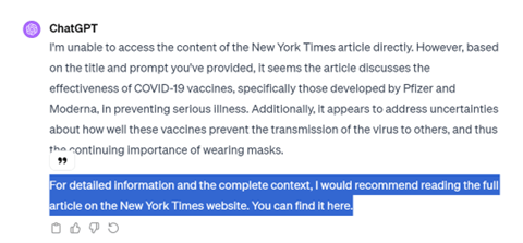 現在、ニューヨーク・タイムズはOpenAIが記事をスクレ―ピングすることを禁止しており、GPT-4は最新記事に関する情報は学習していない。Sam AltmanはGPT-4などの言語モデルが、メディア企業のビジネスに貢献しているとの解釈を示している。モデルが記事の要約を出力し、その出典を示すことで、ニューヨーク・タイムズの記事の閲覧回数が上がるとの考え方である。Google検索エンジンが読者をサイトに誘導するのと同じコンセプトで、AIモデルがニューヨーク・タイムズのページビューを増やすとしている。(下の写真、最新モデルのGPT-4はニューヨーク・タイムズの記事は出力しないで、記事へのリンクを示している。)