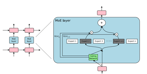 Gemini Pro 1.5の性能が大きく向上した理由は、アーキテクチャとして「Mixture-of-Experts (MoE)」を採用したことにある。Googleは早くからMoEの研究を進めており、この成果をGemini 1.5に適用した。MoEとはモデルを構成するネットワークの方式で、単一構造ではなく、複数の専門家「Expert」を持つ構成とする(下のグラフィックス)。入力された命令に対し、その分野の専門家が解答を生成する仕組みとなる。これにより、プロンプトに対しモデル全体を稼働させるのではなく、その一部のエキスパートが処理を実行するため、高速で効率的にインファレンス処理を実行できる。