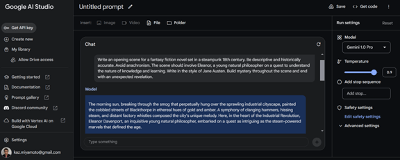 GoogleはGemini Pro 1.5をAIスタジオ「AI Studio」とAIクラウド「Vertex AI」で公開する。AIスタジオは生成AIモデルのプレイグランドで、異なるモデルを使ってその機能や性能を検証することができる。現在は「Gemini Pro 1.0」が公開されており(下のグラフィックス)、「Gemini Pro 1.5」は待ちリストに登録し、認可を得たユーザから利用できる状態となっている。