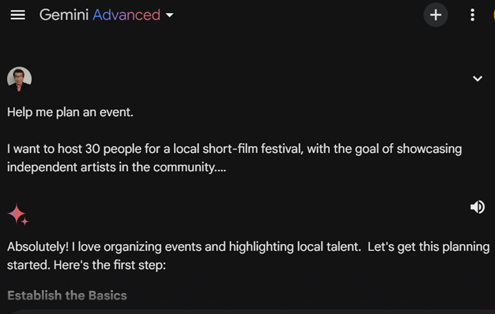 Gemini Advancedは、プロンプトの指示に従って情報を出力するが、人間のプロフェッショナルのように、対話しながら問題を解決する機能が優れている。難しいタスクをステップごとに分割し、それぞれを解決しながら、最終ゴールに到達する。例えば、映画の鑑賞会を立案する方法を尋ねると、Gemini Advancedは、イベントの基本情報や場所の好みなどを質問し、利用者と対話しながら、ステップごとに内容を議論し、最終的プランを提案する(下の写真)。イベントコーディネータと対話しながら、結婚式のプランを立案する方式に似ている。