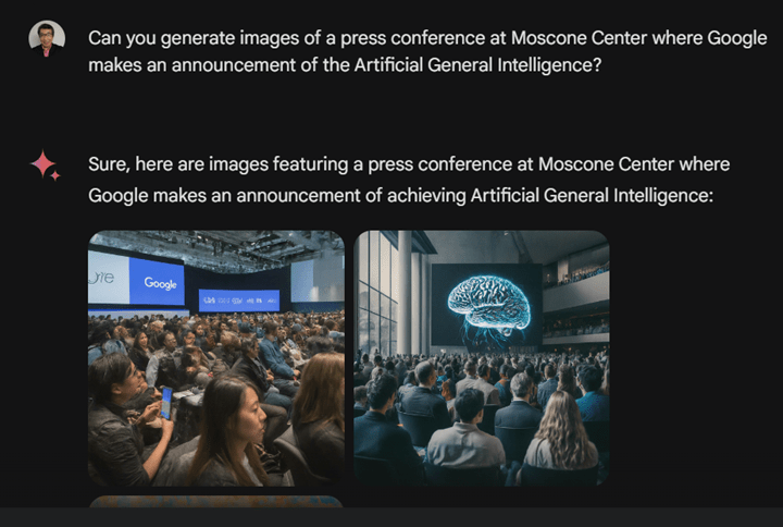 Gemini Advancedはマルチモダル機能が強化され、指示した内容に従ってイメージを生成する。例えば、「GoogleのAGI発表イベントのイメージを生成」と指示すると、それを描き出す(下の写真)。イメージの品質は他社製品と比べて優れているとは言えないが、そのアーキテクチャに特徴がある。他社は「Diffusion」という手法を使うが、Googleは言語モデル「Transformers」でテキストだけでなくイメージなどのマルチモダルをこなす。単一のアーキテクチャで異なるモードのメディアを処理できるため、効率的なネットワークを構成できる。