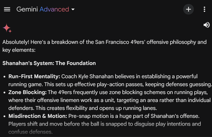 Gemini Advancedを使い始めたが、Geminiの特徴を継承し、この機能が一段と強化されたとの印象を受ける。Geminiは、難しいコンセプトを分解して、モジュールごとに分かりやすく説明するアプローチを取る。学校の先生が生徒に、複雑な内容をステップごとに分け、それぞれを分かりやすく説明する方式に似ている。例えば、アメリカンフットボールで「サンフランシスコ フォーティナイナーズの攻撃の戦略と手法」を尋ねると、Gemini Advancedは、ヘッドコーチの攻撃に関する思想や、主要選手の役割など、多角的に体系立てて説明する(下の写真)。Gemini Advancedを使うと、難しい事柄を理解する時間が大幅に短縮されると感じる。