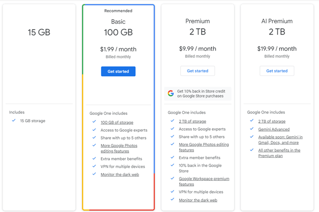 GeminiはBardの後継モデルとして無償で提供されるが、Gemini Advancedは有償モデルとなる。Gemini Advancedは、ストレージサービス「Google One」の中の「AI Premium」に含まれ、サブスクリプションは月額19.99ドルとなる(下の写真、右端)。AI Premiumには、Gemini Advancedの他にGmailなどのアシスタント機能が含まれる。この機能は「Duet AI」と呼ばれていたが、今回の発表で「Gemini」のブランドに統一された。