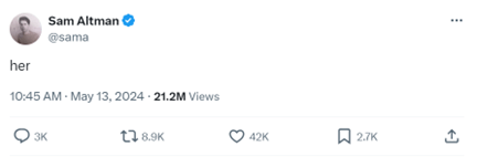 GPT-4oに関して、これはAIエージェントなのか、それともチャットボットなのか、研究者の間で議論が沸騰している。ある研究者は、GPT-4oは仮想の人物で、視覚、会話、聴覚、推論機能を持ち、普通の人間と区別できない、と述べている。別の研究者は、GPT-4oはSF恋愛映画「Her」のAIエージェントであるSamanthaである、と述べている。これに対し、Sam Altmanはツイッターで「her」と答え、このSF映画を手本にしていることを示唆した(下の写真)。