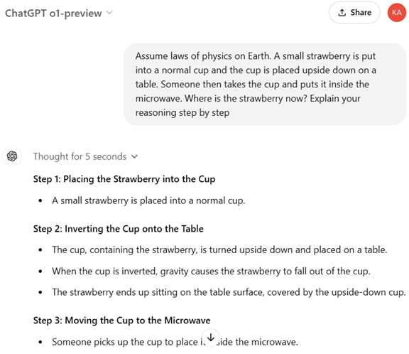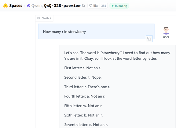 QwQのインターフェイスが公開されており、実際に使って推論機能を検証できる。推論モデルを試験する典型的な質問は「”Strawberry”という単語に”r”はいくつあるか」で、実際に、QwQにこの問題を質問した。QwQは問われたことを整理して、筋道を立てて検証を進め、正しい結論を引きだした。QwQは単語の文字を一つずつ検証し、これが”r”かどうかを判定し、答えは「3」と回答した(下の写真)。