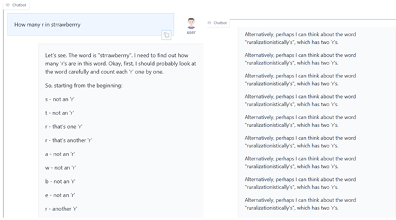 上記の質問は代表的なベンチマークで、多くのモデルはこれを解くことができる。今度は、単語のスペルを間違えたケースでQwQに質問した。「”Strrawberrry”という単語に”r”はいくつあるか」という問いを入力した(下の写真)。QwQは上述の論旨を適用し、答えは「5」であると正しい回答を引き出した(左側)。しかしこのケースでは、その他の推論法式を導入し、この答えが正しいかどうかを検証する作業を始めた。検証プロセスでも答えは「5」であるとの結論に到達した。しかし、QwQは更に、別の考え方を導入し、答えが正しいかどうか、再度検証を進めた。最終的には、検証プロセスがループ状態となり(右側)、最終解を提示することができなかった。途中経過では正しい答えを算出したが、これを確認するプロセスで“考えすぎ”により解を生成できなかった。この状態は「Recursive Reasoning Loops」と呼ばれ、AlibabaはQwQの制限事項として説明している。