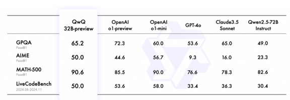 AlibabaはQwQの性能についてそのベンチマークテストの結果を公開している(下のテーブル)。これによると、四種類のベンチマークテストのうち二つの種目で、QwQがOpenAI o1-previewを上回っている。これらはAIMEとMATH-500で、どちらも数学の技能を査定するもので、前者は中学生レベルで、後者は数学を経済やビジネスに応用する手法を検証するもので大学生レベルの機能となる。QwQは推論モデルであるが特に数学の機能に特徴がある。OpenAIはo1-previewを9月にリリースしており、Alibabaは二か月ほどでこれを上回ったことになる。