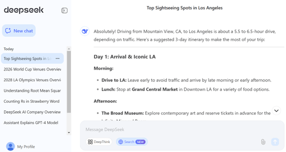 DeepSeek-V3はウェブサイトでチャットボットとして公開されており、実際に使ってその性能を検証することができる。DeepSeek-V3は対話モデルの他に、推論モデル、検索モデルとして利用できる(下の写真、検索モデルの事例、旅行プランの作成)。