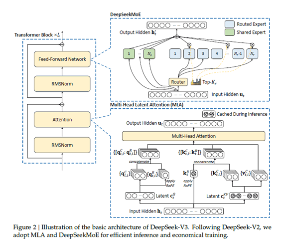 DeepSeek-V3は671Bのパラメータから構成される大型モデルで、「Mixture-of-Experts (MoE)」というアーキテクチャを採用している。MoEとはモデルが複数のモジュールから構成され、トークン(入力データ)に対し最適のモジュール(エキスパート)が回答を生成するという構造となる(下の写真右上の部分)。実際には、257のエキスパートから構成され、1つの共有エクスパートと、256の専門エキスパートが金融や医療など専門分野の知識を持つ。また、DeepSeek-V3は「Multi-head Latent Attention (MLA)」という方式を考案した。これはトランスフォーマ(Transformer)のアテンション機構に関する方式で、インファレンスのプロセスで、「Key-Value」 (入力されたトークンの位置と値の組合せ) をベクトル形式(Latent Vector)に変換し、それを圧縮して格納する(下の写真右側下段)。これにより、実行時のメモリー容量を格段に縮小し効率的に稼働できる。