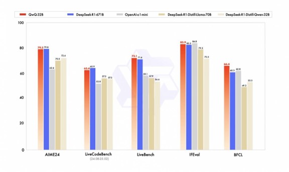 AlibabaはQwQ-32Bのベンチマークテスト結果を公表し、モデルは数学やコーディングやツールを使う機能で高い性能を示した。数学の問題を論理的に解く機能を測定する試験「AIME24」でQwQ-32BはDeepSeek R-1(671B)に対して、それぞれ、79.5と79.8と同等レベルの性能をマークした(下のグラフ左端)。QwQ-32BのサイズはDeepSeek R-1の1/20で、小型モデルが大規模モデルの性能レンジに到達した。