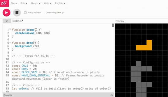 実際にGemini 2.5 Proを使ってみるとプログラミングの機能が極めて高いことが分かる。プログラムを作成するにあたり、コーディングする必要は無く、Gemini 2.5 Proに言葉で指示するだけでコードを生成できる。例えば、人気ゲーム「テトリス」をJavaScriptでコーディングするよう指示すると、Gemini 2.5 Proはコードを生成し、その機能や使い方を説明する(上の写真)。生成されたコードを何も修正することなく、そのままJavaScript開発環境「p5.js」で実行することができる(下の写真)。