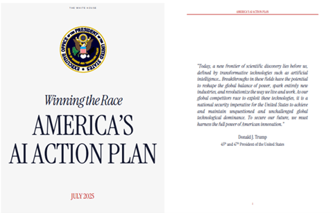 活動指針「AI Action Plan」(下の写真)はAI開発を1960年代の宇宙開発競争に例え、米国が勝利しなければならないとしている。また、スタートアップ企業や大学研究機関の技術革新を支援するため、巨大テックはAIモデルをオープンソースとして公開することを求めている。更に、“アメリカンAI”を同盟国に輸出し、これをグローバル・スタンダードとすることで、米国が世界で覇権を握る構想を打ち出した。