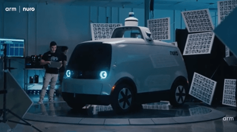 自動運転技術を開発するNuroはNvidiaのエッジプロセッサを使ってロボ配送車両を開発した(下の写真)。ロボタクシーを小売店舗向けに適用し、走るスーパーマーケットとして展開している。クルマのブレインとして「NVIDIA DRIVE AGX Thor」を搭載している。ArmはこのプロセッサのCPUの部分を司り、システムの制御を実行する。