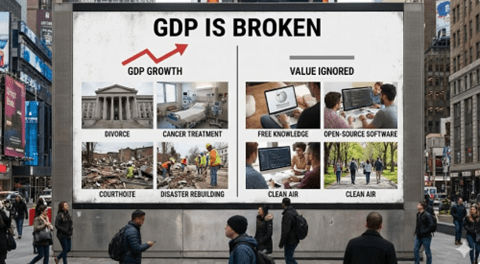 ソフトウェア企業の売り上げが減少すると、これがGDP(国内総生産)の減少に繋がり、景気が後退したと解釈される。GDPは「C+I+G+(X-M)」で算出され、「C(消費)」が減少するとGDPが減少する。しかし、バイブコーディングにより企業は専用ソフトウェアを開発し、ビジネスは拡大している。知能を基盤とする経済「Intelligent Economy」においては、バイブコーディングで巨大な知財を獲得することができる。AGIの経済効果は「Deflationary(デフレ)」であり、インテリジェンスのコストが縮小し、低コストで大きなビジネス効果を得ることができる。GDPはこの現象を反映しておらず、ポストAGI経済では新たな指標の導入が必要となる(下の写真)。
