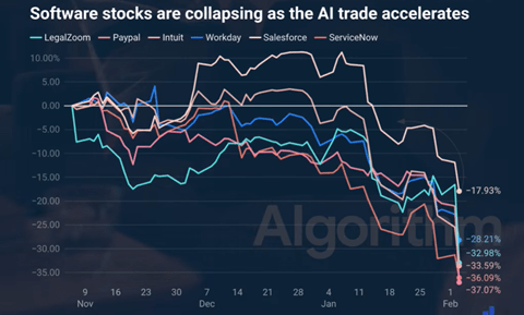実際に、AnthropicはOpus 4.6でCコンパイラを開発し、そのプロジェクトを公開した。Cコンパイラは巨大なシステムで、開発には数か月を要すが、Opus 4.6はこれを2週間で完遂した。AIが巨大ソフトウェアを開発できることが実証され、IT産業に衝撃をもたらした。AIによりソフトウェアは不要になるとの見方が広がり、SaaS企業の株価が大きく下落した(下のグラフ、主要SaaS企業の株価が30%以上下落)。